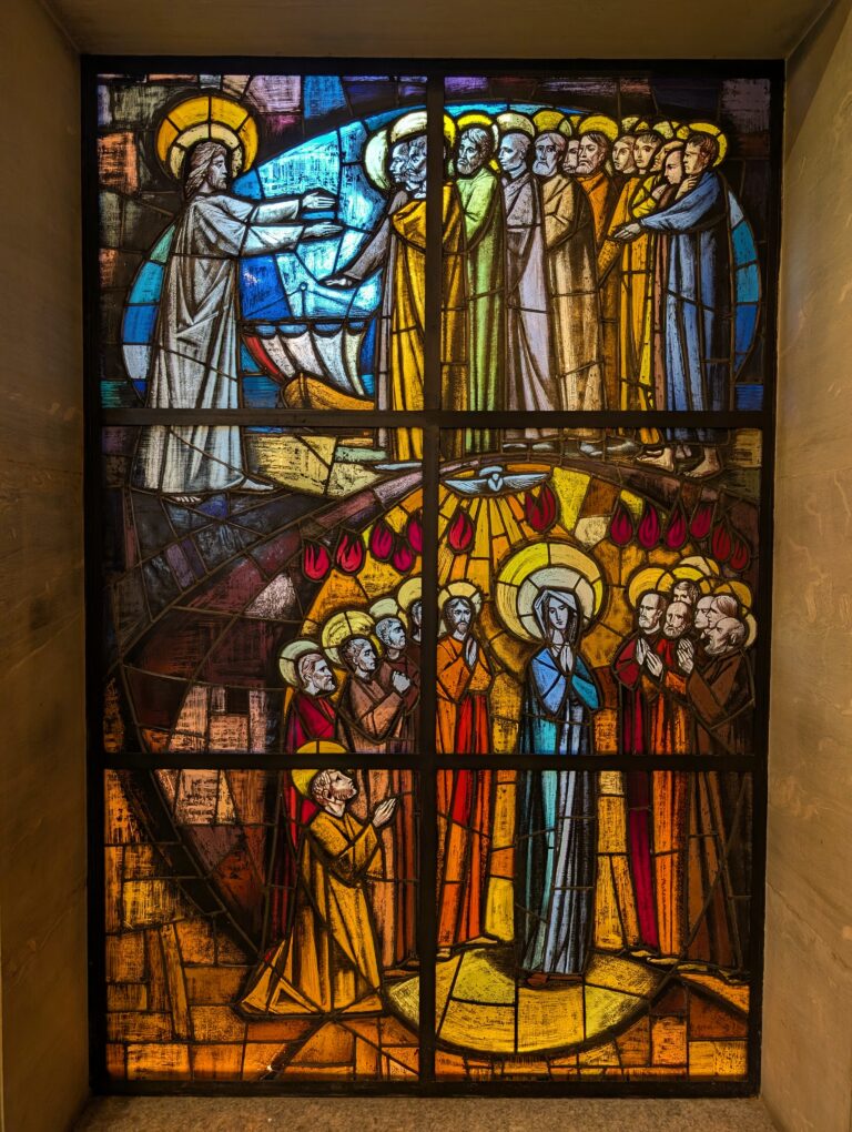 È al piano secondo della nostra struttura che si concentrano le opere d’arte contemporanea: lì l’8 dicembre 1966 Paolo VI inaugurò la Cappella. Fu principalmente ed originariamente sua l’idea di una nuova sede per il Seminario Lombardo, suo l’impegno affinché fosse realizzato, dapprima come Arcivescovo di Milano e poi nei primi anni del suo pontificato. Immaginiamo suo pure l’interesse e la cura per le opere d’arte che, da quel dicembre 1966, impreziosiscono la cappella. Attento alla modernità e mecenate d’arte contemporanea chiamò grandi artisti a dare forma, colore e spazio alla preghiera. Molti di loro avevano anni prima realizzato loro opere per la Cappella privata del Santo Papa all’interno del Palazzo Apostolico. L’arte nuova è ricerca nuova del mondo dello spirito. Ma in questo sforzo, in questa ricerca, originale e fuori di ogni convenzione, può ritrovarsi un omaggio degno a colui che ha tutta consacrata la vita fra noi per spingerci a cercare il mondo dello spirito, il quasi smarrito mondo dello spirito. Ricerca è preghiera, preghiera è ricerca. Un’arte che prega.
