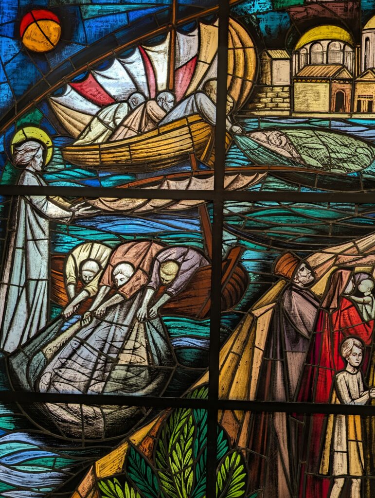 Una folta e affascinante teoria di scene evangeliche, in vetro istoriato, fascia l’aula liturgica per l’intero fianco sinistro. Trento Longaretti cuce con il piombo i vetri colorati, animati dal racconto che intesse con il suo disegno: dalla nascita alla resurrezione di Gesù Cristo sino al dono dello Spirito. L’artista è il veicolo, è il tramite, è l’interprete, è il ponte fra il nostro mondo religioso e spirituale e la società e l’esperienza degli altri e le anime con cui veniamo a colloquio. …] È la sua magia, è la sua missione. Perciò, l’artista è mediatore fra noi che abbiamo il tesoro della parola divina, dell’ineffabile, e il nostro tempo il nostro popolo, il mondo umano, a cui dobbiamo parlare un discorso divino.