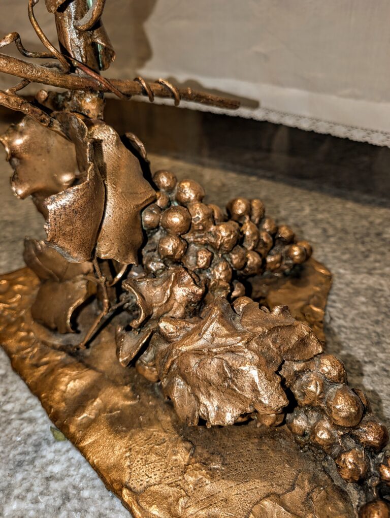 In basso, sulla base della croce astile, tralci e grappoli d’uva. Sui grappoli d’uva maturi Scorzelli adagia delle foglie di vite appassite: il contrasto con quelle poco sopra, verdi e turgide, richiama il suo naturalismo ed espressionismo manifestato sommamente dalla figura del Cristo.